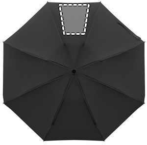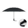 23-tommer 3-foldet vindtæt paraply lavet af 190T RPET-pongee og matchende pose. Automatisk åbning og lukning, fuldt sortbelagt stel, glasfiberribber og et gummibelagt ABS-håndtag.