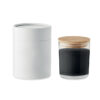 Vanilla fragranced wax candle 120gr in glass with bamboo lid in paper tube gift box. 7 cm diameter.