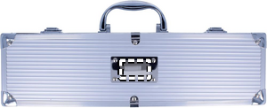Aluminium kuffert indeholdende 3 rustfrit stål grillværktøjer. Plade til logotryk.
