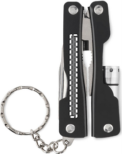 Sammenfoldelig multiværktøjskniv med lommelygte i rustfrit stål. Indeholder 10 værktøjsfunktioner inklusive 600D polyesterpose. Inklusive 3 x AG3 knapceller.