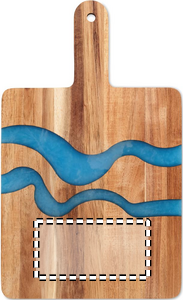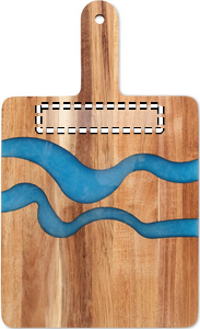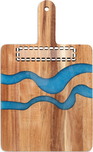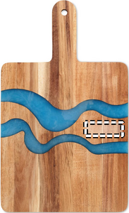 Serveringsbræt af akacietræ med epoxyharpiksdetalje og håndtag.