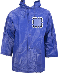 PVC regnfrakke med hætte. Trykknap lukning.