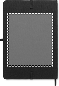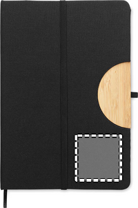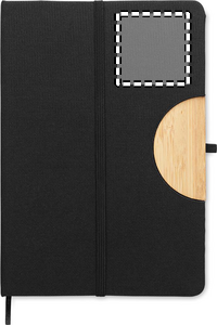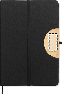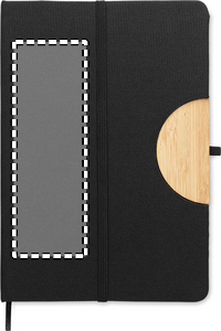 A5 notebook with 600D RPET hard cover with bamboo detail with a smartphone stand function. Casebound. 160 lined pages (80 sheets). 70 gsm recycled paper. Matching elastic closure strap, ribbon page-marker and pen holder. Take this office essential with you to your next meeting. Having a remote meeting? Fold open the phone holder and put in your device so you don't have to hold it yourself. FSC®-certified | FSC MIX CREDIT, P7.1, FSC-C213206