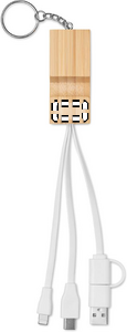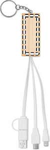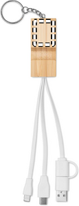 Nøglering med bambuscover og telefonstativfunktionalitet med opladningskabel med 2-i-1 Type-C og Type-A. nInput: 2-i-1 Type-C & Type-A. Udgang: Type-C og 2-i-1-stik (Type-B og Lightning).