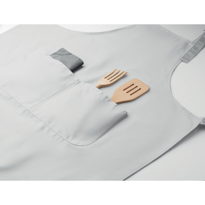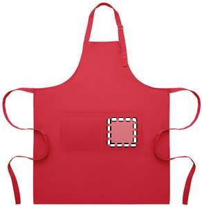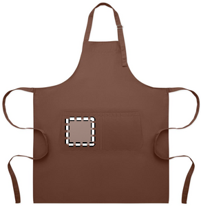Langt justerbart køkkenforklæde i 240 gr/m² polycotton (35 % bomuld, 65 % polyester) med to forlommer og justerbar strop med metalspænde.