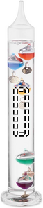 Galileo termometer i glas med fem farvede svævende kugler. Hver kugle angiver temperaturen fra 18°c til 26°: Rød 26°, kongeblå 24°, orange 22°, grøn 20° og lilla - 18°. Den nederste kugle i den øverste gruppe angiver omgivelsestemperaturen.