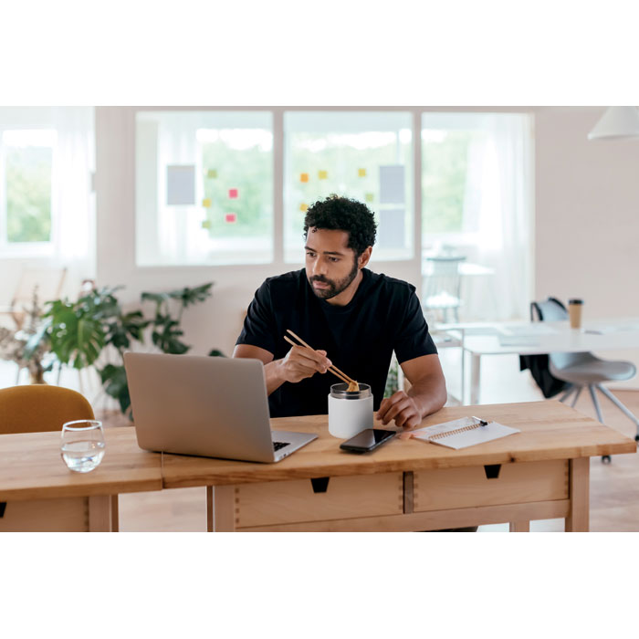 Dobbeltvægget isoleret frokostbeholder af 90 % genanvendt rustfrit stål og 10 % rustfrit stål med PP-låg. Kapacitet: 500 ml.