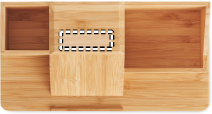 Bamboo desk organizer and pen holder with 10W wireless charging phone stand. Output: DC 9V/1.1A (15W) for quick charging. FSC®-certified | FSC 100 %, P5.7, FSC-C213206 FSC 100% | N5.7 | FSC-C213206