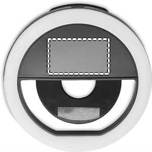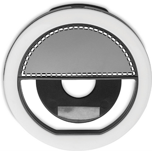 8 cm portable selfie ring light in ABS material with 28 LED's. White light adjustable to 3 different brightness levels. USB rechargeable 80 mAh battery.