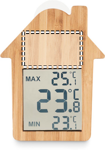 Husformet vejrstation i bambus med sugekop på bagsiden. Med dette termometer kender du altid temperaturen i dit hjem. LED-displayet viser den aktuelle, minimale og maksimale temperatur. På bagsiden er der en sugekop til at hænge det lille hus op på et vindue, skab eller andet sted. 1 LR44-batteri medfølger. Bambus er et naturprodukt, der kan forekomme små variationer i farve og størrelse pr. stk. hvilket kan påvirke det endelige dekorationsresultat.