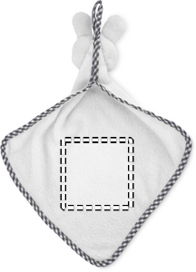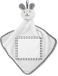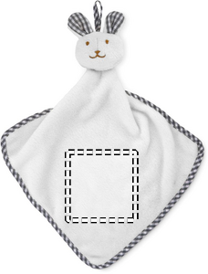 Plush baby towel in velvet polyester with rabbit design on the top. 180gr/m².