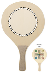 Strandsæt med 2 ketsjere i krydsfiner med skak- og ludobræt. Inkluderer 1 TPR-bold, terninger og brikker. Pakket i RPET-netpose med lynlås. FSC®-certificeret krydsfiner.