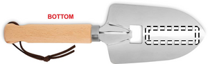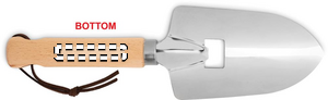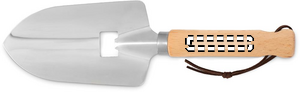 Trowel shape bottle opener in wood and stainless steel with string loop.