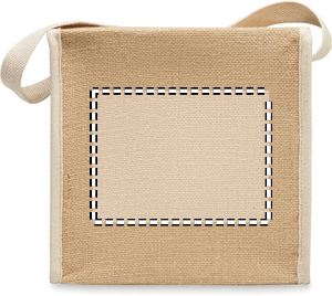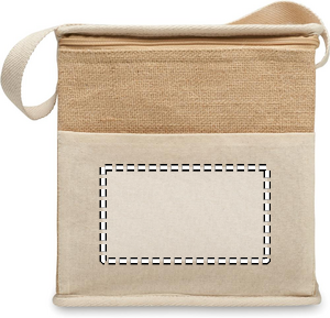 Køletaske i jute med bomuldsstrop og frontlomme til 6x0,5 L flasker. Isolationsmateriale: 3 mm aluminiumsfolie. Kapacitet 3L.
