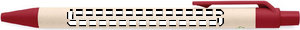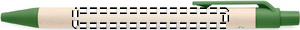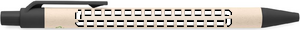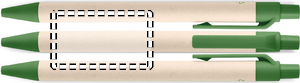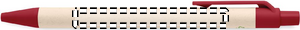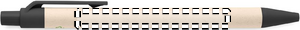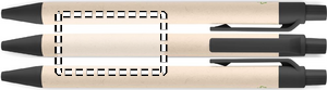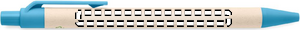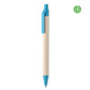 Trykknap-kuglepen med tønde af genbrugte mælkekartoner (70 % genbrugtsmælkekarton og 30 % genbrugspapir) og PLA-dele (i 100 % bionedbrydelig majs). Blå blæk.