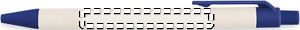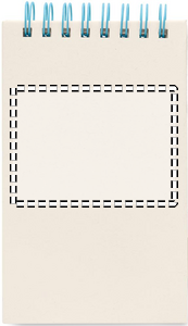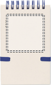 A6 notesbog i almindeligt papir med 70 ark (70 % genbrugsmælkekarton og 30 % genbrugspapir) med tilhørende kuglepen. Ringbundet. Matchende kuglepen med trykknap. Blå blæk. Elastisk lukningsrem og penneholder.