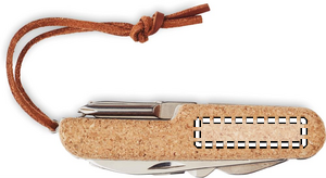Multifunktions lommekniv i rustfrit stål med korkdeltajer og PU-snor. 7 funktioner. Den indeholder 2 åbnere, kniv, saks, skruetrækker med Philips-spidser, fil og vinoplukker.
