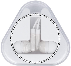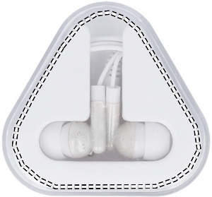 Høretelefoner i PVC indbygget i en trekantet PS beholder. Kabellængde 120 cm.
