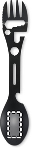 Multiværktøjsbestik i rustfrit stål. Værktøjet omfatter ske, gaffel, justerbar skruenøgle, oplukker, sekskantnøgle, savtakket kniv, oplukker og positioneringsnøgle.