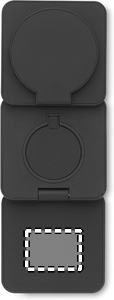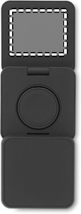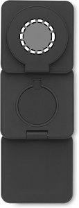 3 i 1 foldbar opladningsstation i gummieret genbrugs-ABS. Den indeholder en magnetisk trådløs oplader på 15W, en smartwatch-oplader (kun Apple®) og en TWS-oplader.