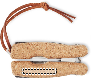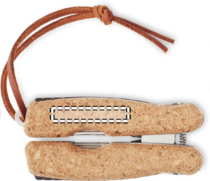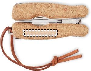 Multifunktions værktøj i rustfrit stål med korkdetaljer og PU-håndtagssnor. 9 funktioner. Den indeholder: Tænger, 2 åbnere, skruetrækker med Philips bits, savklinger, kniv, fil og skruetrækker med flad bit.
