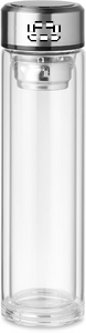 Glasflaske med dobbeltvæg i boroisilikatglas. Borosilikatglas kan modstå store temperaturforskelle uden at revne og er velegnet til både varme og kolde drikke. leveres med LED-berøringstermometer indbygget i låget for at se temperaturen på indersiden. Drevet af et 1 CR2032 batteri, inkluderet. Lækagefri. Volume: 390 ml. Lækagefri.