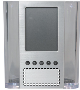 Penholder med kalender, vækkeur og termometer. 1 celle batteri medfølger.