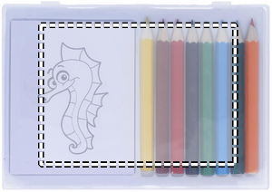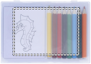 Farveblyanter i transparent æske indeholdende 8 træblyanter og 20 papirtegninger.