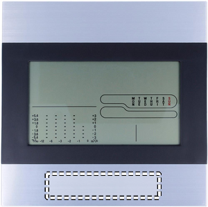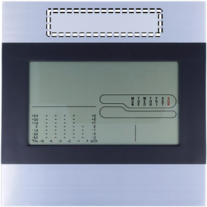Sort og sølv vejrstation. Inkluderer et ur, temperaturfugtighedsdisplay og kalender. 2 AAA batterier ikke inkluderet.