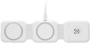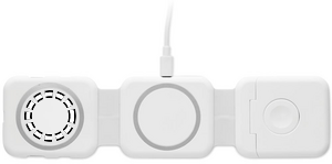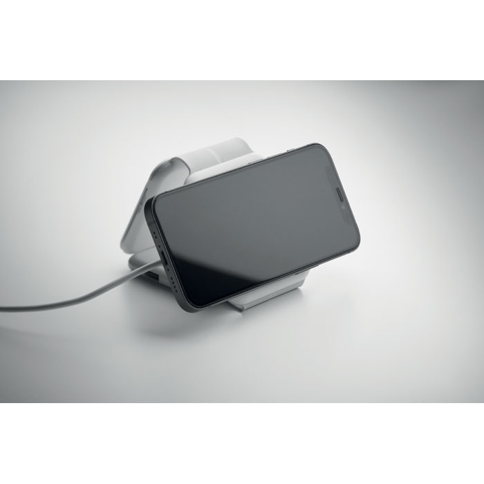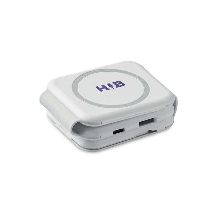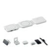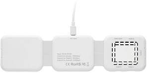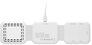 Magnetisk ladestation i ABS. 3 trådløse opladningspunkter. 1 x 15W, 1 x 5W til TWS og 1 Apple watch-oplader (3W). 2 Type-C & 2 USB-A HUBS. Integreret kabelindgang: stik fra Type-C til USB-A.