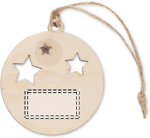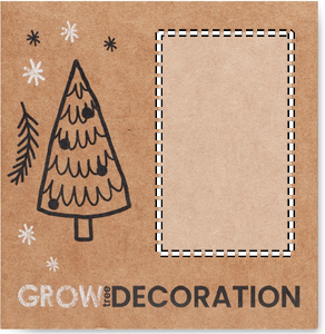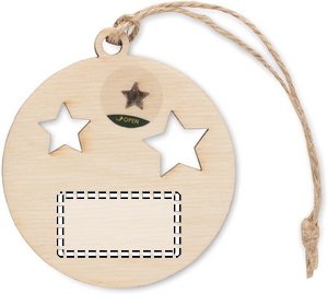 Kugleformet dekorationsophæng i træ med jutesnor og granfrø. Præsenteret i kraftkonvolut.