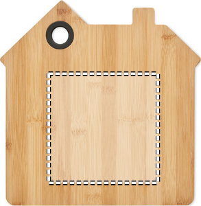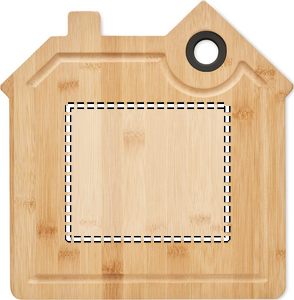 Skærebræt i bambus formet som hus med rille og hængehul.
