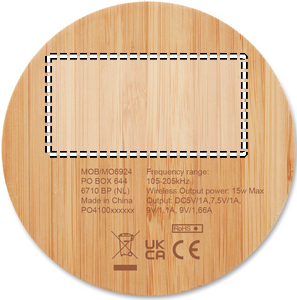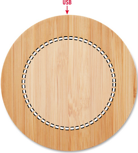 Trådløs hurtigoplader i bambus. Tilslut enheden til din computer, placer smartphone på den, og lad den oplade. Blå indikator lys, når den oplades. Output: DC 9V/1.67A (15W).