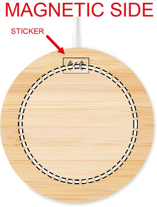 Magnetic bamboo wireless charger. Output: DC 9V/1.1A (10W) for quick charging. Compatible with iPhone® 12 and newer. Including additional magnetic metal ring to support charging of other non-magnetic wireless chargeable phones.