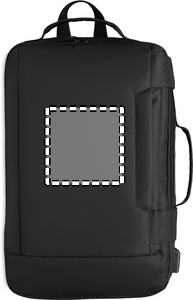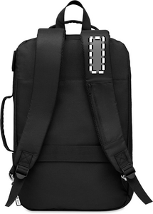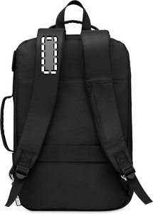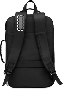 Computer backpack in 300D RPET Polyester with padded shoulder strap including one main internal compartment for 16 inch laptop and a USB charging cable.