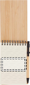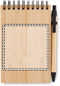 A6 notesblok med bambusomslag med 70 ark linjeret genbrugspapir. Der medfølger en matchende genbrugskuglepen med PLA-spids og klip. Skriv alle dine vigtige noter ned under møder på arbejdet med denne praktiske kontorartikel. Bambusomslaget giver den et dejligt naturligt touch. Både pennen og papiret er fremstillet af genbrugspapir, hvilket gør dette til et bæredygtigt valg. Pennen har blåt blæk. Bambus er et naturprodukt, der kan forekomme små variationer i farve og størrelse pr. genstand, hvilket kan påvirke det endelige dekorationsresultat. FSC®-certified | FSC MIX, P7.7, FSC-C213206