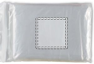 Sammenfoldelig plastponcho med vedhæftet hætte, pakket i en gennemsigtig pose.