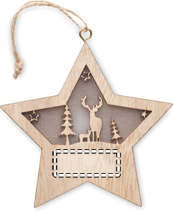 MDF dekoreret stjerne med lys indeni med julepynt og ophængssnor. Inklusiv 3 LR44-batterier.