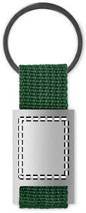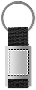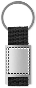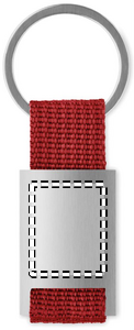 Metal rektangulær nøglering med farvet polyesterbånd.