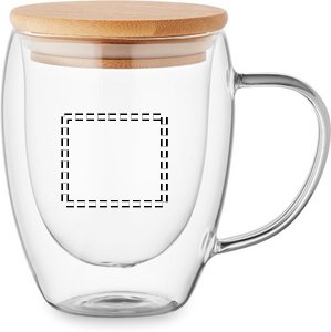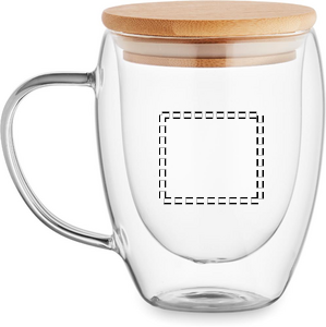 Dobbeltvægget krus i borosilikatglas med hank og bambuslåg. Kapacitet: 250 ml.