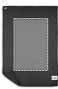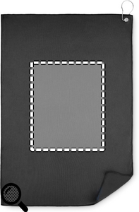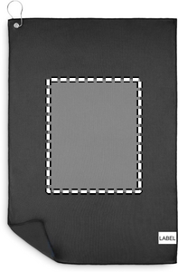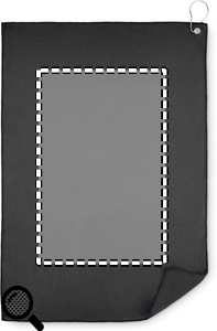 RPET polyester golfhåndklæde i polyester med bøjle med metalkroge. Håndklæde størrelse: 40x60cm. Brug dette golfhåndklæde til at tørre golfbolde, dine køller eller hænder. Øg grebet ved at tørre dit udstyr tørt og holde det rent og i perfekt stand. Hæng håndklædet på din taske med metalkrogbøjlen. Dette håndklæde er fremstillet af genanvendt PET-plast.