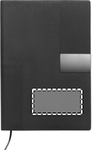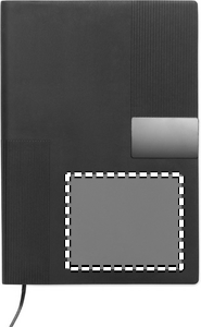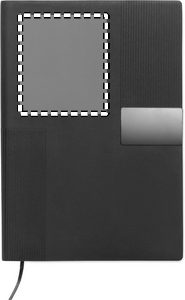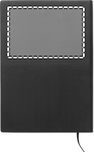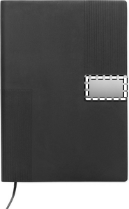 A5-notesbog med blødt PU-omslag. Indbundet. 160 linjerede sider af genbrugspapir (80 ark). Matchende elastikbånd og bogmærke i bånd. Jerndetalje i metal på forsiden.