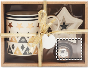 Ceramic mug set including mug, tea filter and mini plate. Presented in carton box with PVC sleeve and cord with label.