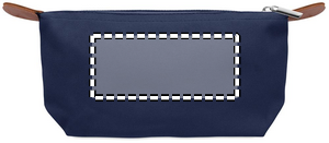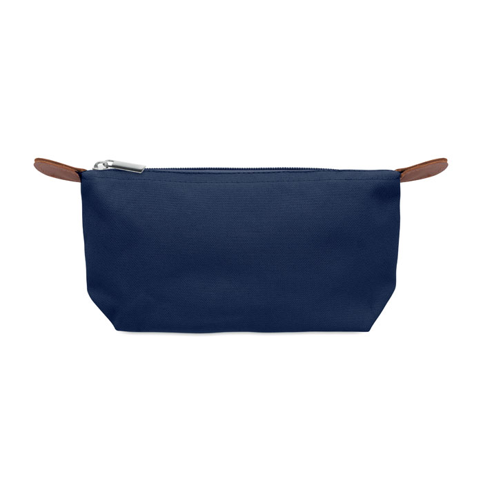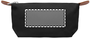 Kosmetiktaske af 600D RPET-polyester med lynlåslukning i toppen og brune PU-detaljer.