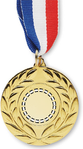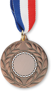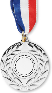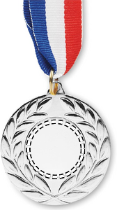 Medalje af jern med polyesterstrop i farverne blå, hvid og rød. 5 cm i diameter