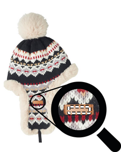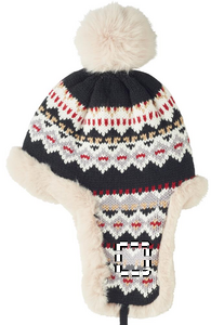Strikket hue med øreklapper og pom pom i akrylfiber med polyester- og fleecefor. Indeholder etiket til tryk på den ene side. Størrelse til voksne.